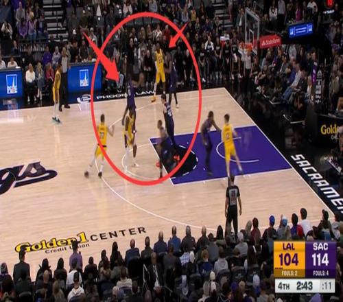 他先是运球来到前场,站在左侧底角附近晃了半天,突然想助攻队友,却把传球给到了对手蒙克的手上。你没有看错,詹皇上来之后,正在追分的关键时刻,他直接传球送给自己的前队友蒙克,一个失误被国王队抢断发起反击。